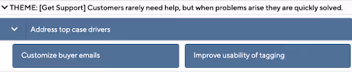 The support phase is focused on making support resources easily accessible, improving resolution speed, building out various support channels, and reducing the need for support in the first place. The product team can have a significant impact on this outcome by doing this, like implementing an in-product support experience or, as in the example below, dedicating focus to address the top product case drivers.CUSTOMER KPI: Transactional Net Promoter Score (tNPS), Time to case resolutionBUSINESS KPI: Tracking against operational cost efficienciesSTAKEHOLDER PARTNER: Customer Support