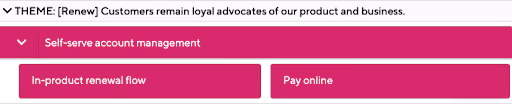 The renew phase looks at every opportunity to keep customers happy coming back to your product or service. Almost all SaaS businesses are looking at churn, and addressing those reasons is perhaps the most apparent epic under this theme. But, similar to some of the other themes, there may be opportunities to reduce effort by integrating account management experiences within the product, such as this example that would introduce a renewal flow and add the ability for SaaS customers to pay their invoice online (instead of sending a check).CUSTOMER KPI: Net Promoter Score, Customer Satisfaction (CSAT) scoresBUSINESS KPI: ChurnSTAKEHOLDER PARTNER: Customer Success