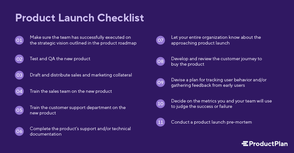 Businesses need to plan their product launches strategically and well in advance of their planned launch date. This is because a successful product launch requires the coordinated effort of many teams and departments across the company—not only product management and development, but also marketing, sales, customer support, finance, PR, etc.Every organization’s circumstances are unique, but a typical checklist should include at least the following:1. Make sure the team has successfully executed on the strategic vision outlined in the product roadmap2. Test and QA the new product(Note: Product launches for software products typically happen only after several levels of testing have been completed. Alpha testing is a product’s first round of end-to-end testing, usually done by the company’s employees. When the product clears this level, the company will send for beta testing, which involves real users but is still before the official commercial release of the product.)3. Draft and distribute sales and marketing collateral4. Train the sales team on the new product5. Train the customer support department on the new product6. Complete the product’s support and/or technical documentation7. Let your entire organization know about the approaching product launch8. Develop and review the customer journey to buy the product, make sure the process is as smooth as possible9. Devise a plan for tracking user behavior and/or gathering feedback from early users10. Decide on the metrics you and your team will use to judge the success or failure —for example, revenue or new users within a certain timeframe.11. Conduct a product launch pre-mortem— where your product team thinks through possible problems or missteps that could hurt your product launch and prepares plans of action for each potential problem in advance.