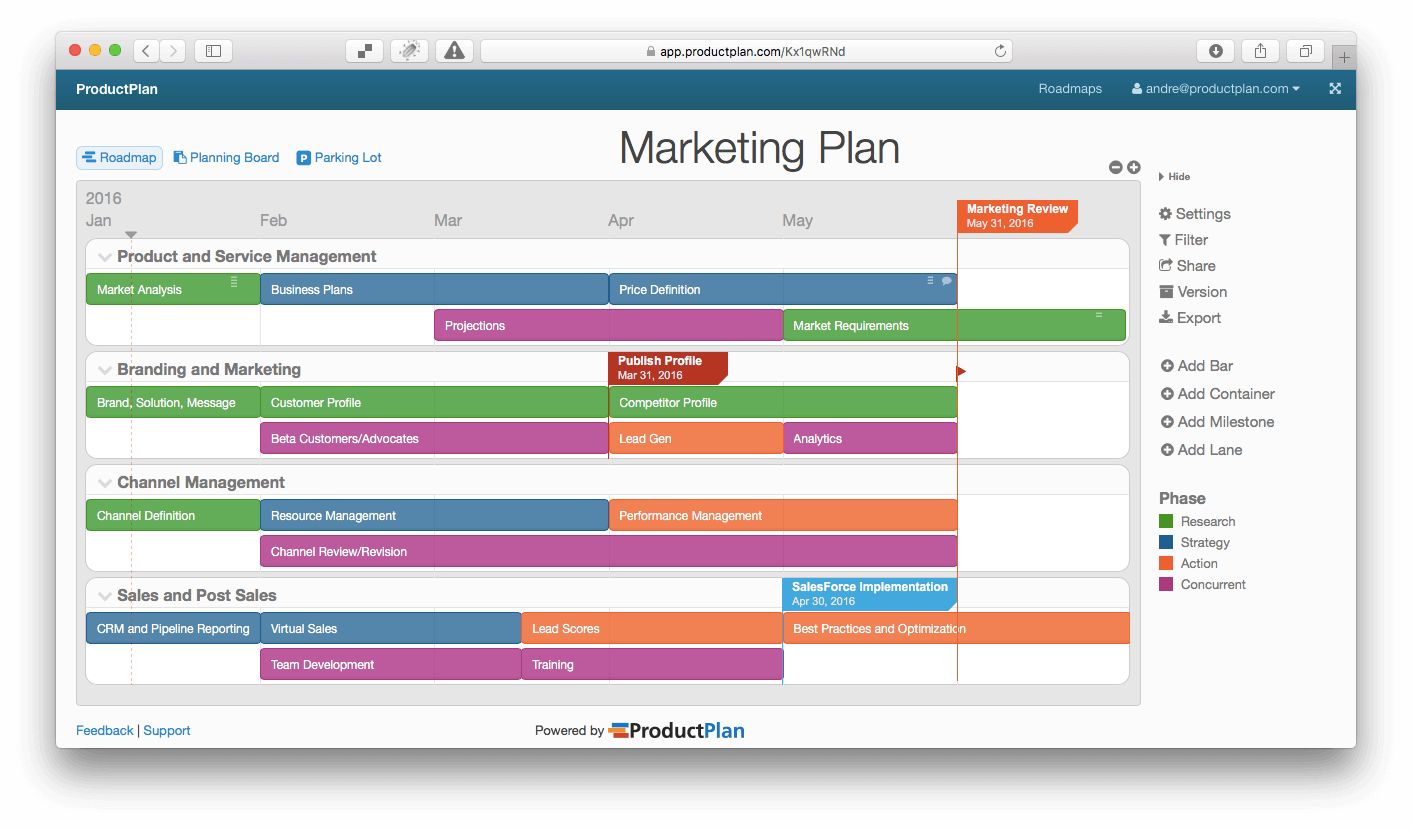 Here is an example of a marketing roadmap built with ProductPlan. One advantage of using web-based roadmap software is that the plan functions as a living document that the marketer can easily update and share across their organization. For additional examples, check out this post covering three marketing roadmap examples.