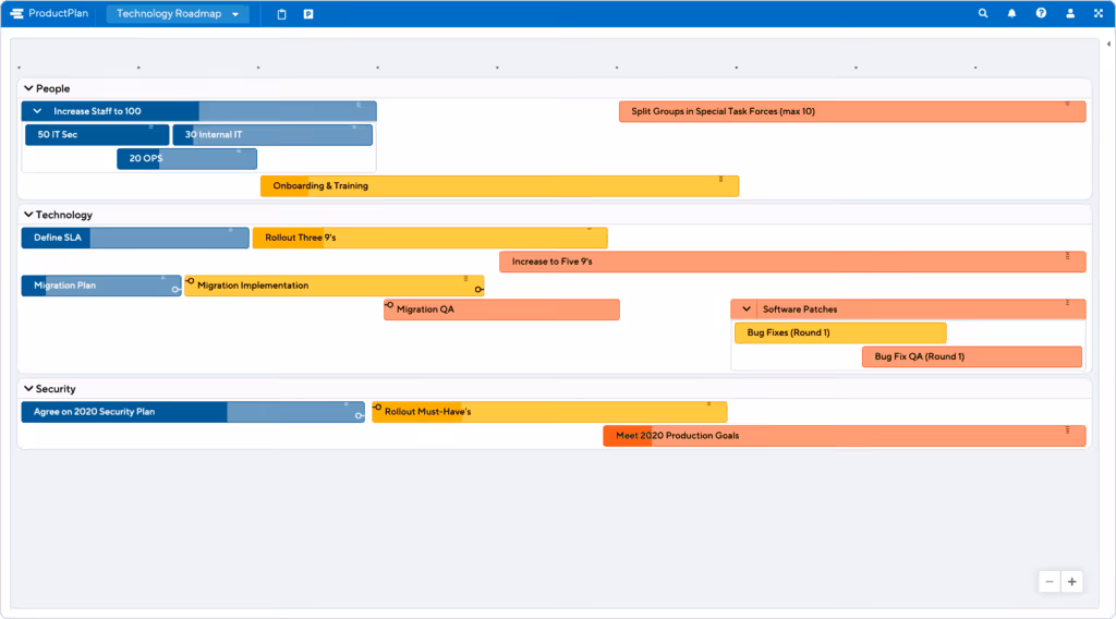 You can use a roadmap to plan out strategic technology initiatives in the future. Initiatives like, migrating different software systems or rolling out software updates. Your audience for a technology roadmap will be stakeholders looking to the IT team for delivering internal-facing systems and solutions. The technology roadmap may also be shared with partners and vendors who rely on integrations and other technology from the organization.In the example illustrated here, the roadmap is divided into three different categories: People, Technology, and Security. The colors indicate the status of each initiative. The roadmap can have a time horizon such as the next year.A technology roadmap can also be broader in scope. Focus on the creation of new technology entirely instead of deploying existing technology across a company or department.The key to a successful technology roadmap is its ability to quickly and effectively communicate the strategic plan to the right constituents.