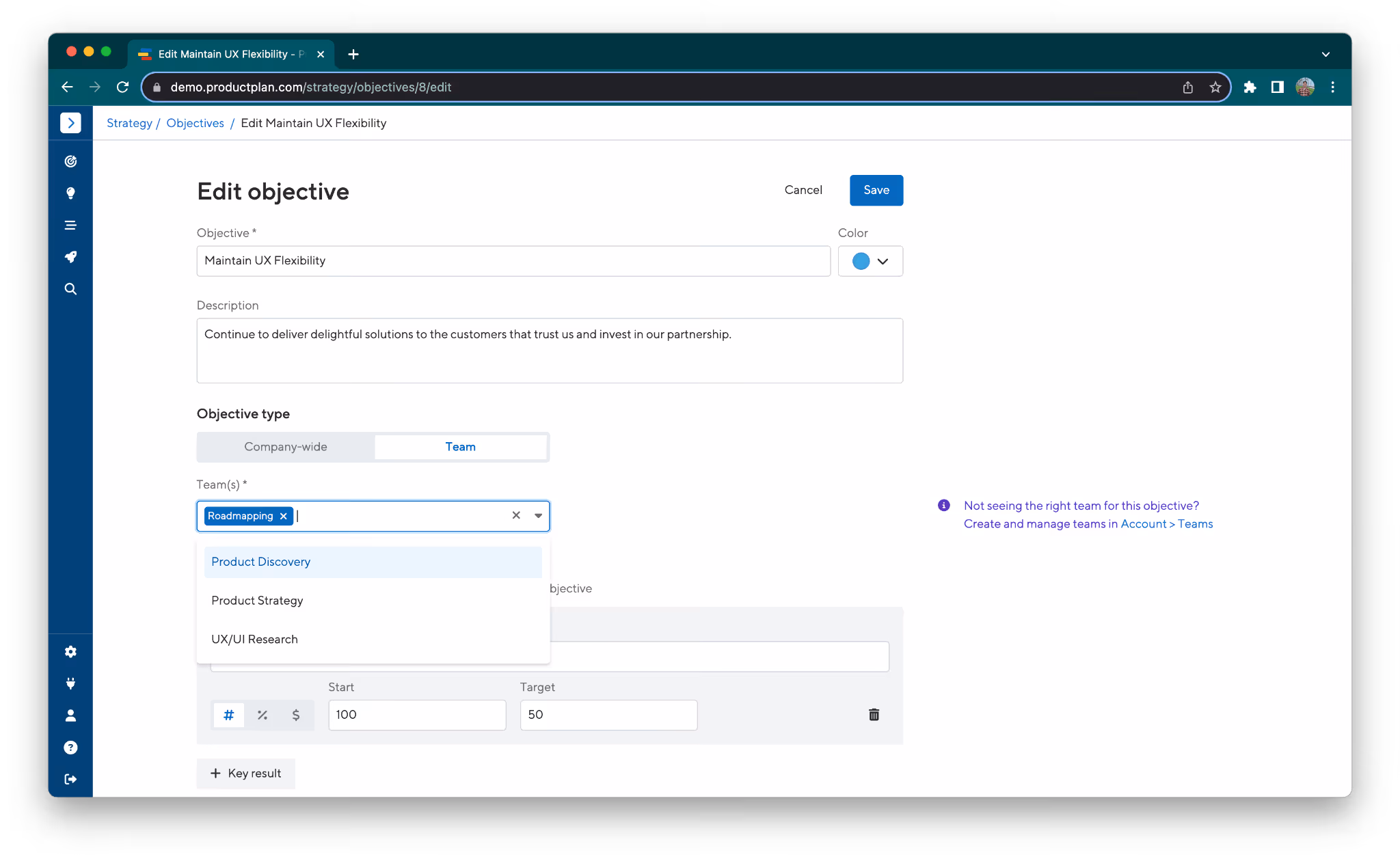 We are bringing Teams into the Product Strategy space, allowing Professional and Enterprise users to associate and filter Objectives by Team.