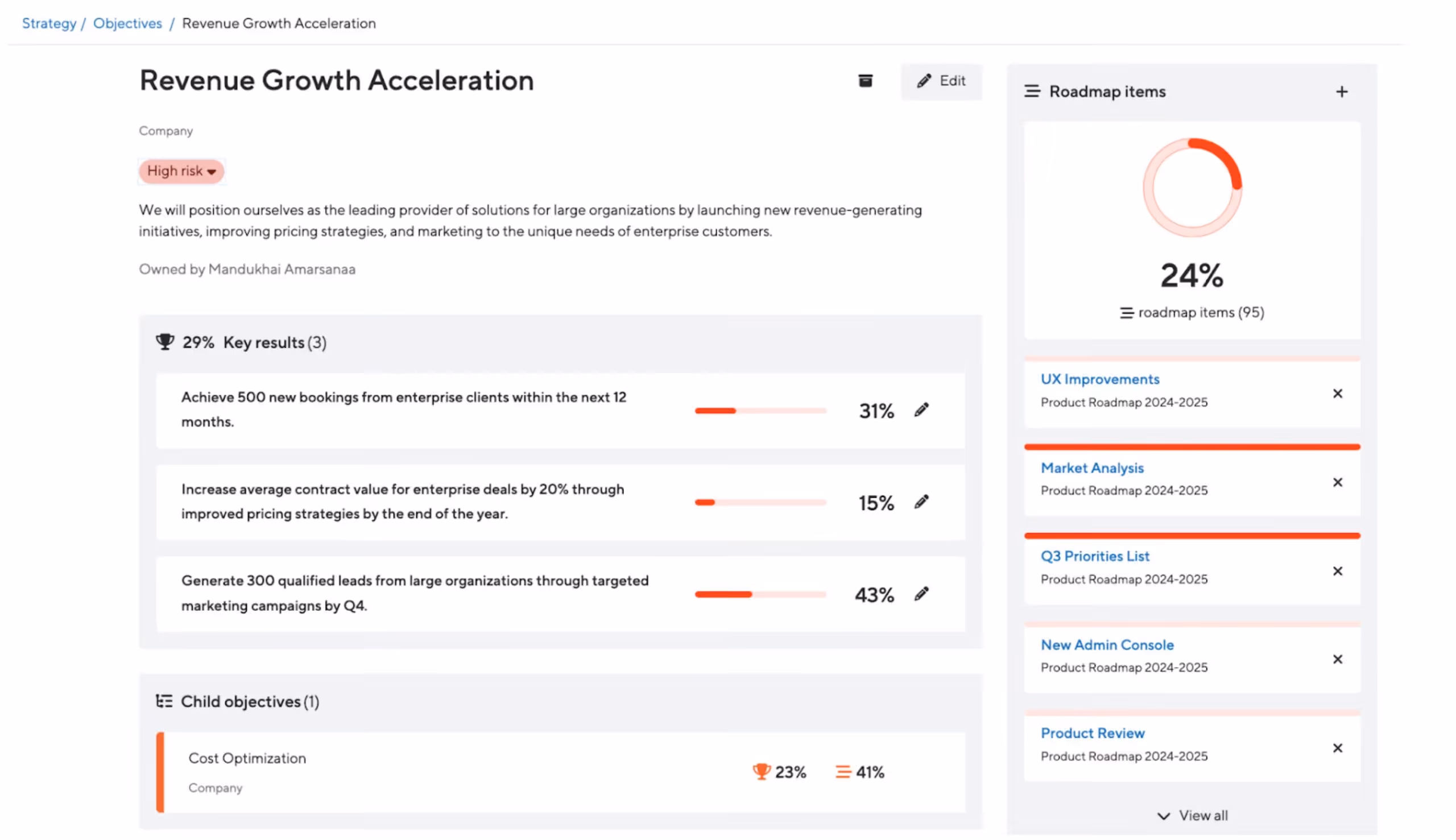 Customers will now have the ability to cascade OKRs (Objectives and Key Results) throughout different levels of their organization, from company-wide objectives down to individual department or team objectives. Simply put, there will be an ability to relate a child objective to a parent objective.