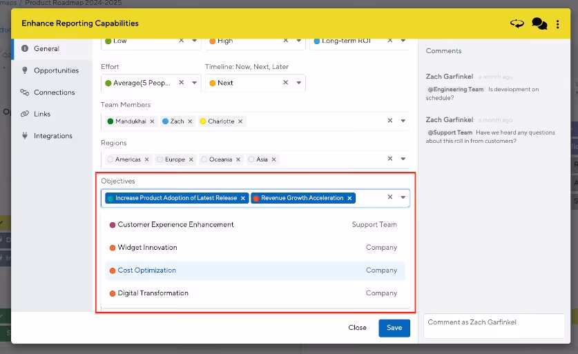 Customers will now have the ability to connect a roadmap bar or container to more than one objective in the Strategy module. This update removes the limitation of assigning a bar or container to just one objective. You’ll now have a more accurate representation of how work (each bar and container) supports different strategic goals.