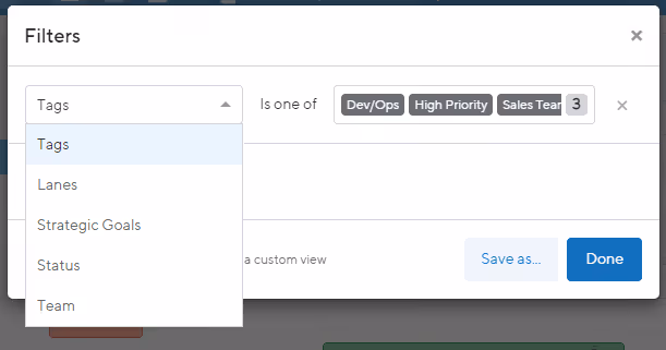 Let’s say you want to filter by tags. By clicking into the right hand dropdown field, you can easily see which tags are available for you to select and filter from. In this case, we’ve filtered by high priority items owned by either the Dev/Ops team or the Sales Team. You can then save that filter as a new personal or custom view.Aside from an overhauled filtering UI, we have a few additional enhancements:
