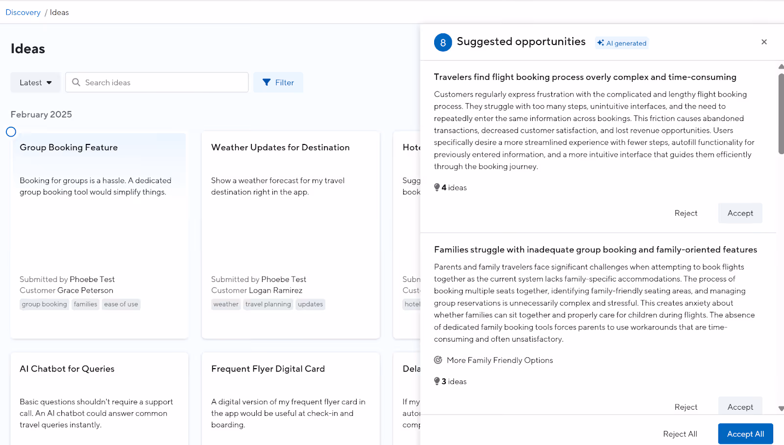 Users will now have the ability to leverage AI to automatically generate Initiatives based on submitted ideas, such as customer feedback, feature requests, and other inputs. AI Suggested Initiatives will identify patterns across ideas and generate Initiatives from them- focused on providing problem statements that represent potential market opportunities by surfacing common user needs found in the ideas portal. This feature will also identify Initiatives that have potential to be aligned with strategic objectives to ensure a direct connection between customer needs and company goals. Additionally, account administrators now have the ability to opt their organization into ProductPlan's suite of AI-powered features through a centralized in-app toggle. This opt-in applies to all current and future AI capabilities, ensuring that organizations can seamlessly access new innovations as they are released. This opt-in must take place before an account can access the AI generated opportunity feature.