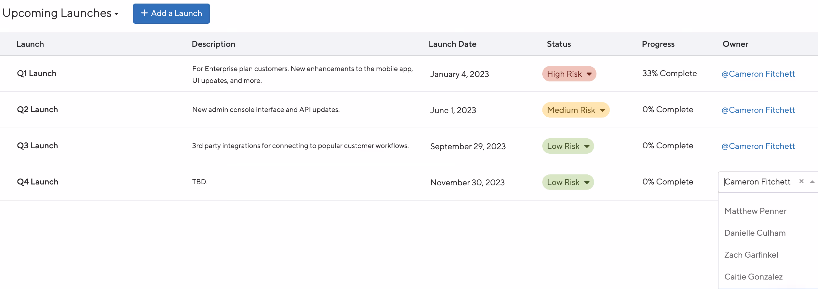 Today, you have the ability to add a launch owner from the Launch Dashboard. By default, the launch creator are the owners. The owner can be updated to a different user or removed altogether. This will help you to identify a point of contact for a specific launch within your company.