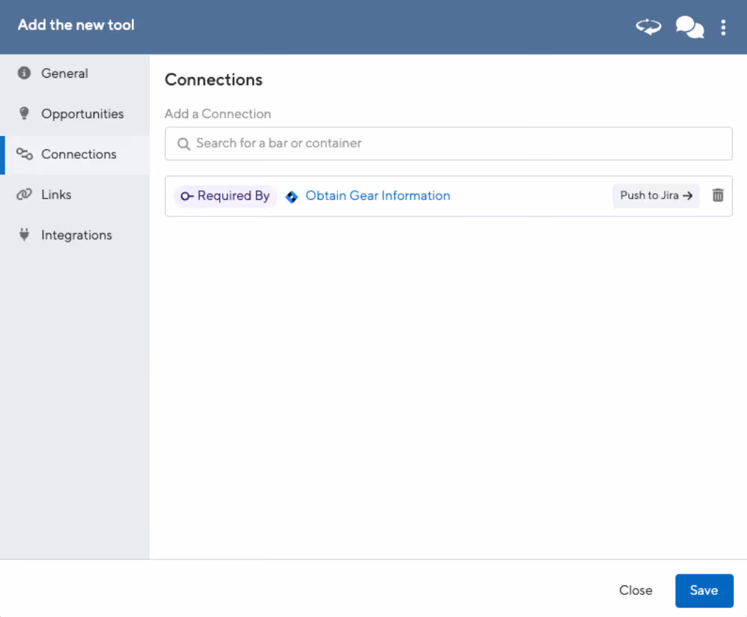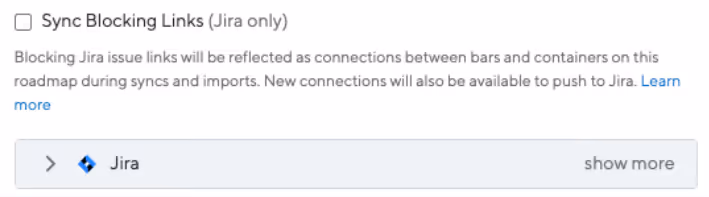 To start, go to a roadmap and click on the roadmap’s Settings modal. You must have your Jira integration set up first. Click on the Integrations tab then find the “Sync Blocking Links” item. Click on the checkbox next to it to enable the sync.Once you've enabled syncing, you can then import Jira issues that have a "Blocked / Is Blocked By" link created between them. These issues will be imported as roadmap bars with established Connections ready to go.Conversely, when a connection is created between two bars on a roadmap, a “Blocked / Is Blocked By” link can be created when you click on “Push to Jira” for one of the bars. This can be found in line with the associated Jira issue that is shown in the Integrations tab of the bar details.Moving forward, we're excited to provide similar functionality for our ADO integration. More on that at a later date.