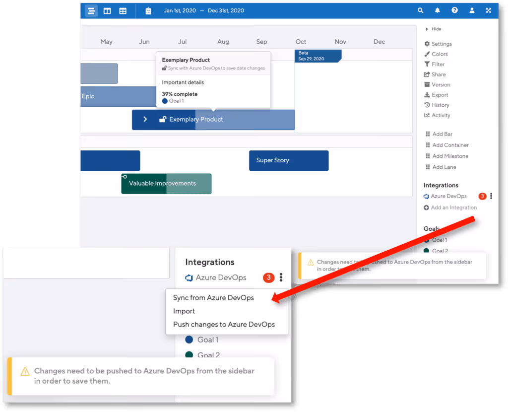 For now, our two-way integrations for Jira and ADO will only feature the ability to push date changes to your delivery tools. For this to work, dates need to be mapped in your integration settings. Once you have that set up, anytime you drag a bar or change a date you’ll have the option to push those changes to either Jira or ADO from the sidebar. Changes that aren’t pushed will be overwritten during the nightly sync.