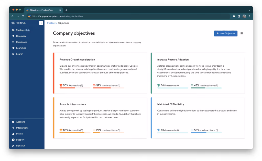 Today, we’re adding a more robust Key Results offering to Strategy in ProductPlan. Initially, you were only able to measure success by the completion of specific projects listed on your roadmap. While this is a great way to measure outputs, it doesn’t give you the full picture. With Key Results, we want to give you a way to measure outcomes too. Now, you are able to add and track whatever metrics are most important for each objective. That could be revenue targets or customer adoption goals. For tips on setting the right Objectives and Key Results in ProductPlan, refer to our guide here. Once you have your Key Results in place, any updates to progress will be reflected in the high-level view of all Company Objectives as shown below.