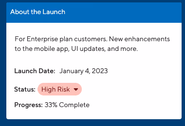 Additionally, you can now view the launch progress (expressed as a percentage) in the About the Launch section on the individual checklist page. This percentage takes all the task statuses on the checklist into consideration and calculates the percent complete and presents it as a quick reference that can be easily shared with your stakeholders.
