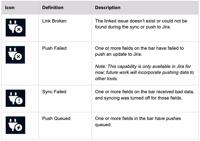 Historically, roadmaps have contained lock icons that only indicate whether or not data is actively synced with their integrations. We are replacing these lock icons with plug icons that will give you a clear visual representation of the status of the data presented for your integrated tools. You can find a detailed list of all new iconography and what information they're communicating below: